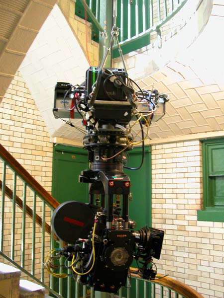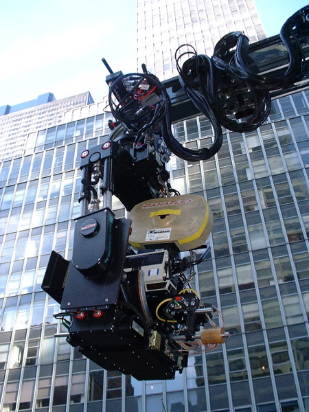 The GYRON FS / STAB-C (Gyron Film System / Stabilized Camera) is a unique 5-axis stabilizing camera system which eliminates adverse motion artifacts from pan, tilt and roll. This completely silent system allows an entire range of cameras, from Hi-DEF video to IMAX 15perf/65mm film cameras. It can be used on any type or size of camera crane, camera car, cable support, construction-style telescopic crane, and helicopter work producing stable images throughout a typical 25-600mm (film lens) zoom range. With advanced notice the system can be upgraded to completely stabilize a 1000mm or greater film lens during aerial or ground work.