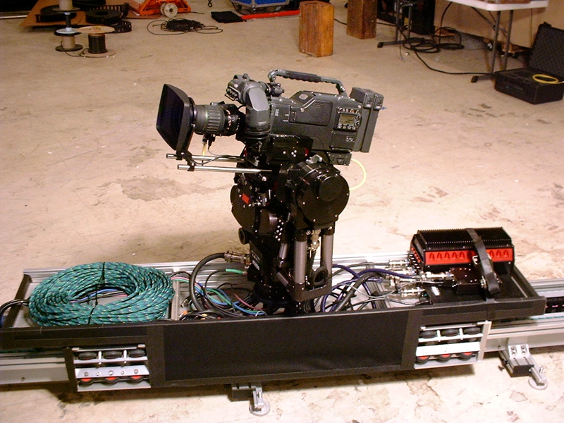 TrackRunner is the award winning high speed tracking system for the Broadcast and Film industries that is able to move any remote head/camera combination, including the larger gyro-stabilized remote heads, up to a combined weight (camera plus head) of 200 lbs. at relatively high speeds with a cable management system that is unique in the industry today. This system has been tested with the energy chain cable management system at speeds of 45MPH with a 175lb payload and is capable of reaching speeds of 60MPH (RF only) with a new lightweight fiberglass sled that is currently under development. Placed at the performance level along the floor, TrackRunner’s small footprint and unique cable management provide the Director with the ultimate in tracking shots. The Sleds (dolly’s) are “captured” on the track and a cleverly captured “energy chain” cable management system is contained within the track section. The energy chain rides on a special Teflon like surface keeping the noise generated by the system to a very acceptable level making it ideal for both sports and entertainment venues. There will be a variety of sleds that can be ordered with the system. Sleds are being constructed that will serve a variety of functions including a Lightweight Sled for high-speed operation and a Sled with a boom function that will raise the camera to a lens height of 10feet. The Multi-purpose sled comes standard with the TrackRunner. The precision track comes in 2meter (6.6’) or 3meter sections and can be ordered in Silver/Grey for outside use (1200 Feet available) or Black (150 Feet available) for entertainment uses. The Sled (dolly) is controlled remotely by a computerized joystick or operator foot pedal that can be operated at a distance of 3000’ from the track set-up. The computerized handset can be programmed by the Technician to store start and end marks as well as ramps and speed gates. Redundant emergency stop buttons and a special air brake system for the sled are provided for safe high-speed operation.